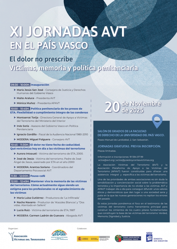 El próximo jueves 20 de noviembre la Asociación Víctimas del Terrorismo (AVT), en colaboración con la Asociación Plataforma de Apoyo a las Víctimas del Terrorismo (APAVT), celebra sus XI Jornadas en el País Vasco, que llevarán por título "Retos actuales de las víctimas del terrorismo: cómo construir un futuro aprendiendo del pasado". Las Jornadas, que se celebrarán en San Sebastián, en el Salón de Grados de la Facultad de Derecho de la Universidad del País Vasco, contarán con la presencia de numerosos profesionales que aportarán su visión sobre los títulos de las diferentes mesas que conforman las Jornadas.