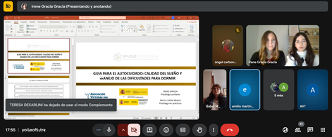La Asociación Víctimas del Terrorismo (AVT) celebró el pasado lunes 27 de octubre una nueva sesión del Taller de Herramientas Psicológicas, organizado en colaboración con Studio Psicología. En esta ocasión, la jornada llevó por título “Guía para el autocuidado: calidad del sueño y manejo de las dificultades para dormir”.