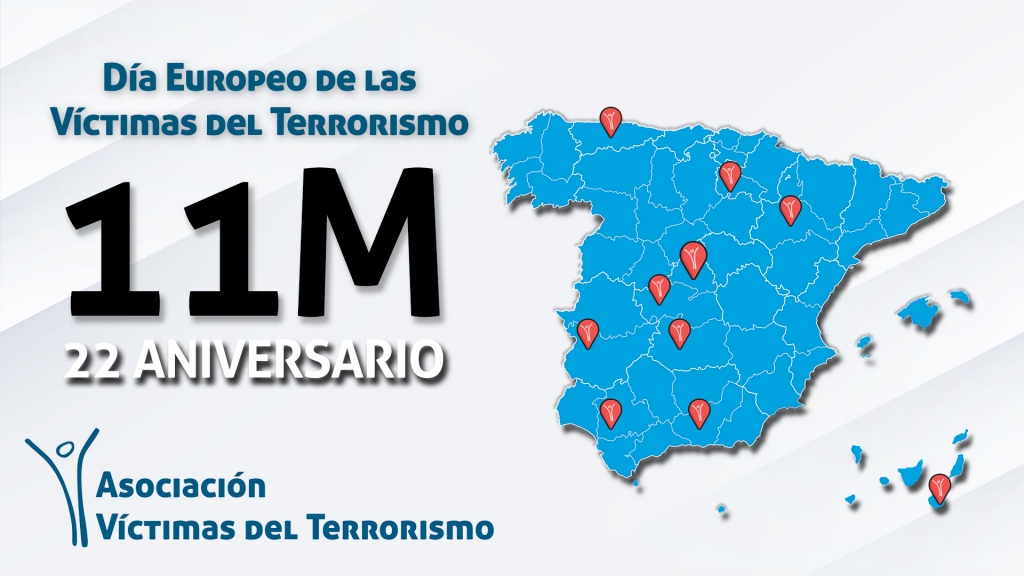 Este 11 de marzo acompáñanos a rendir homenaje a las víctimas del terrorismo en su día europeo, donde tendremos un recuerdo muy especial para las víctimas de los atentados del 11 de marzo del 2004 en Madrid en su 22 aniversario. Madrid, Logroño, Sevilla, Oviedo, Zaragoza, Valencia, Toledo, Argamasilla de Calatrava, Badajoz, Granada y Las Palmas de Gran Canaria serán los escenarios de nuestros homenajes.